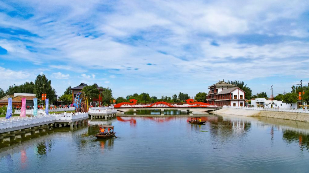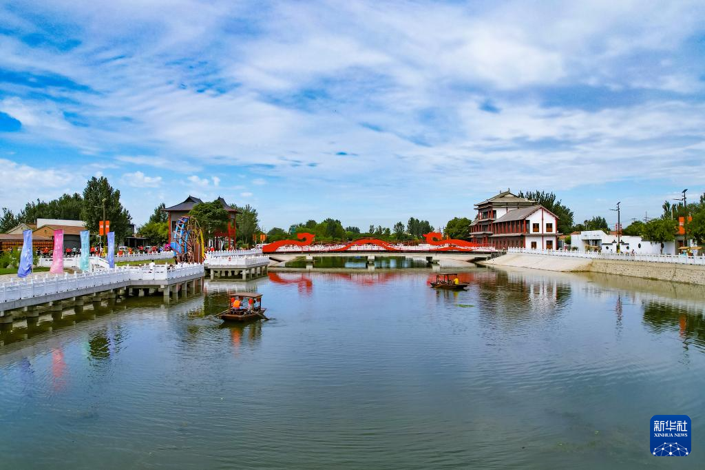 游客在齐家营宋风潮玩街区划船游览。新华社发