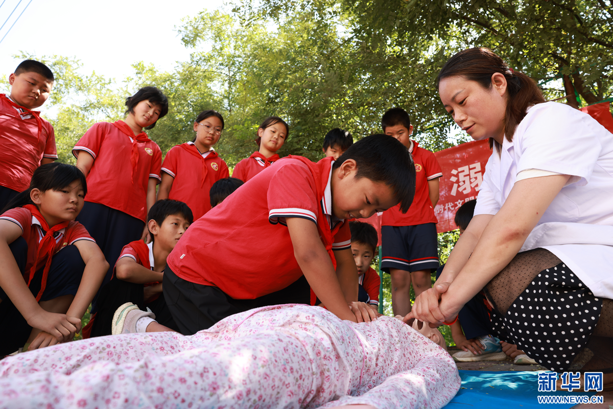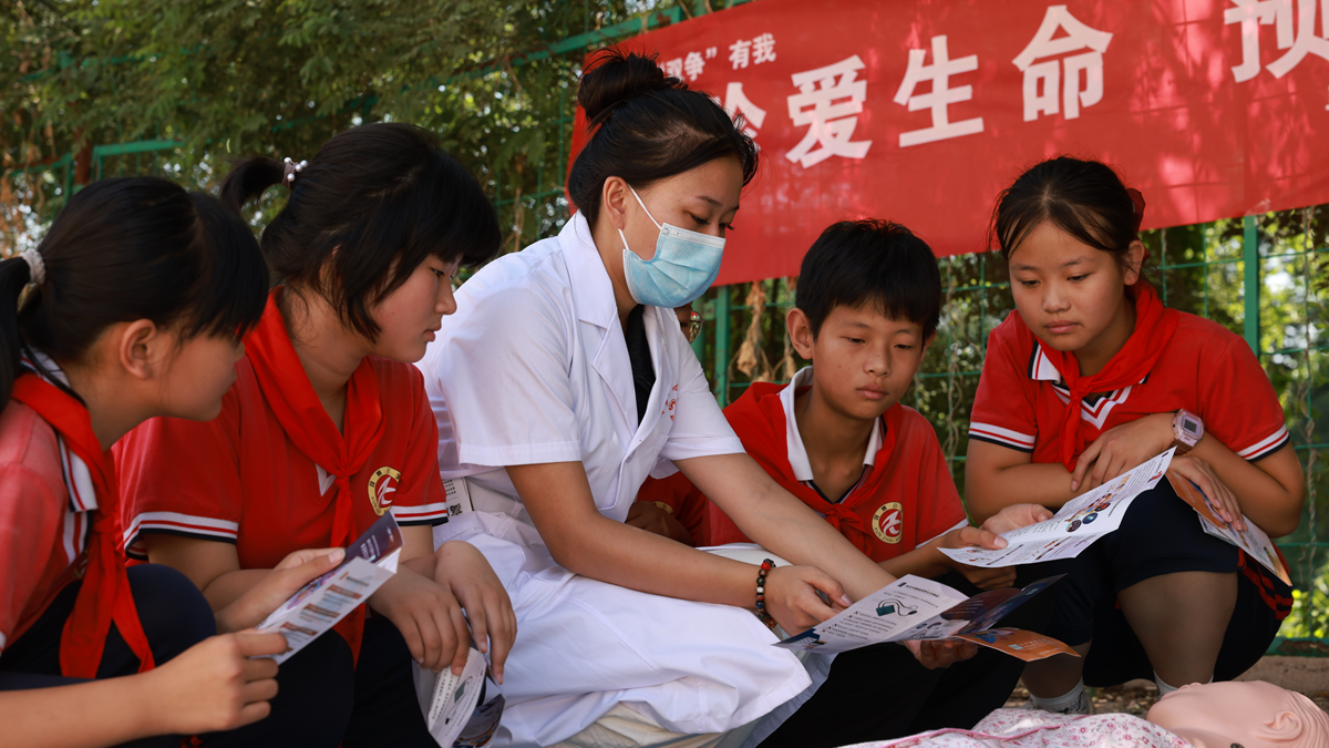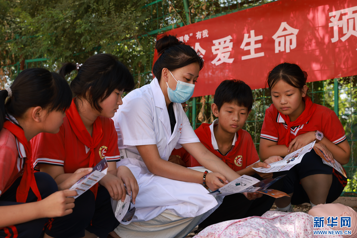 医护人员向学生讲解防溺水安全知识。新华网发 李世强 摄