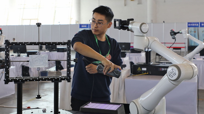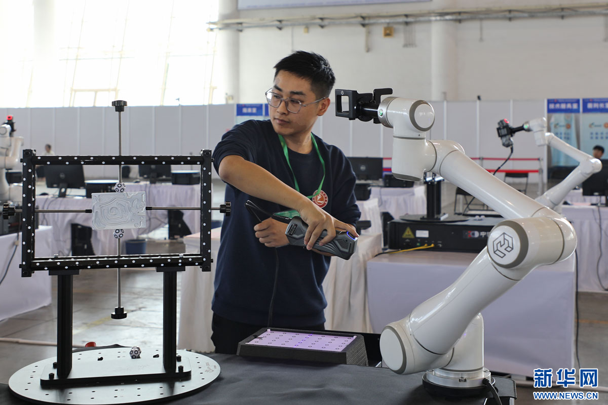 10月25日,在无损检测员技能比赛现场,选手在进行零件的三维数字化智能检测。新华网 魏会博摄