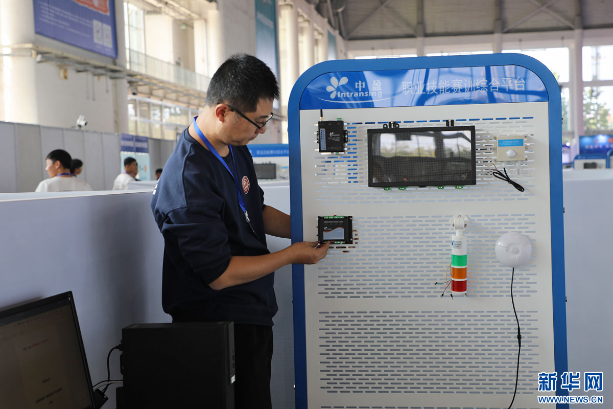 10月25日,在智能硬件装调员技能比赛现场,选手在进行智能硬件布控。新华网 魏会博摄