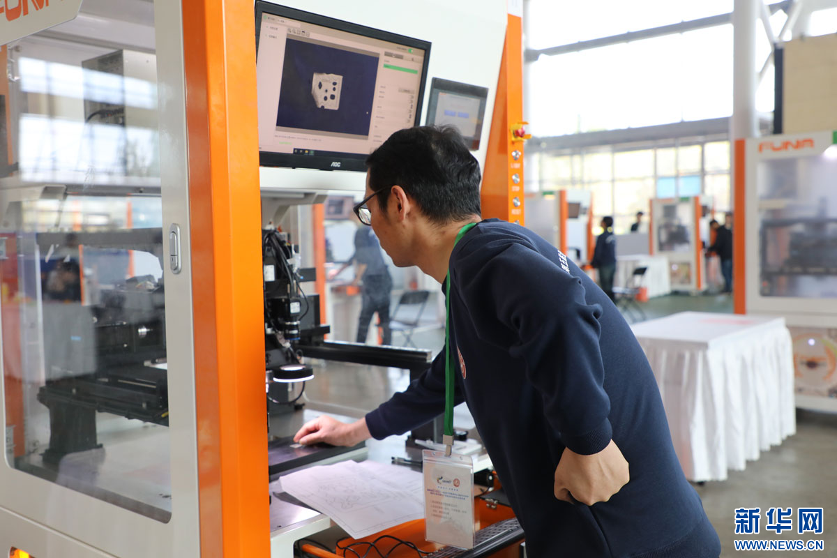 10月25日,在计算机程序设计员技能比赛现场,选手把自己设计的产品用3d打印设备制作出来。新华网 魏会博摄