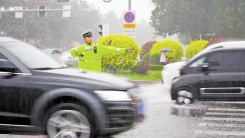 7月2日,在保定市莲池区七一路与恒祥大街交口,交警冒雨疏导交通。 本报记者 许佳奇摄