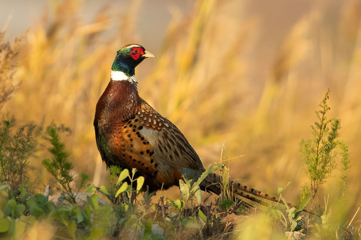 环颈雉多栖息在丘陵的灌丛、竹丛或草丛中,善于奔跑,飞行快速而有力,喜食谷类、浆果和昆虫。(刘洵)
