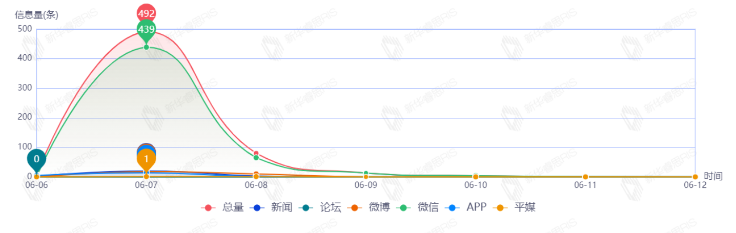 自6月6日首发至6月12日一周内,该文章在互联网上传播总量为600篇。其中6月7日是信息发布的高峰期,发布信息量为492篇文章。各信源的信息发布情况中,微信信息占比最大,其次是微博和新闻,信息量分别为522、28、25,占比分别为87.44%、4.69%、4.19%。(数据来源:新华睿思数据云图分析平台)
