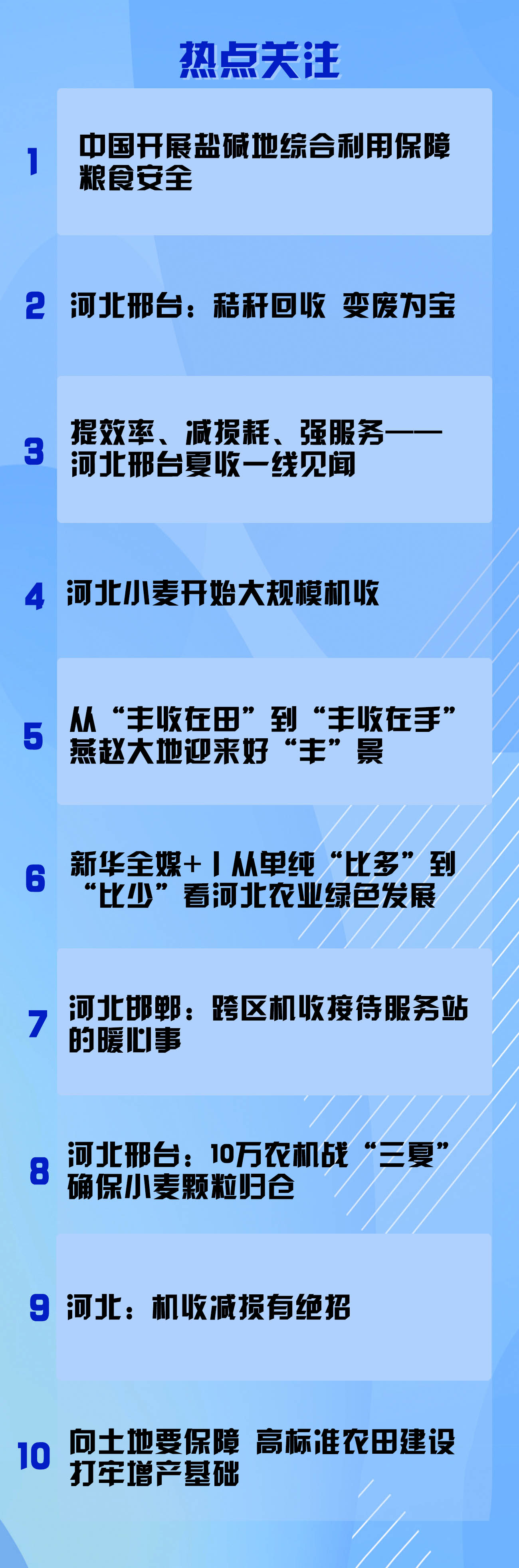 目前,产粮大省河北夏收进入尾声,丰收已成定局。记者在河北多地采访了解到,河北聚焦农业生产关键环节,从生产、机收、储存等方面,为“丰收在田”转化为“丰收在手”提供保障,确保小麦颗粒归仓。(新华社记者郭雅茹、赵鸿宇)