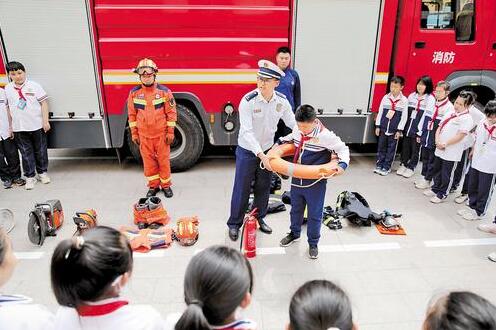 5月10日,在承德县实验小学,承德县消防救援大队工作人员指导学生使用救生圈。5月12日是全国防灾减灾日,承德县实验小学联合当地消防救援大队开展防灾减灾宣传教育进校园活动。 河北日报通讯员 刘环宇摄