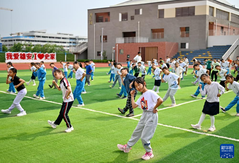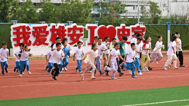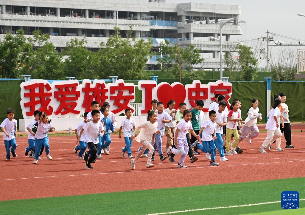 5月21日,雄安史家胡同小学学生在操场上运动。