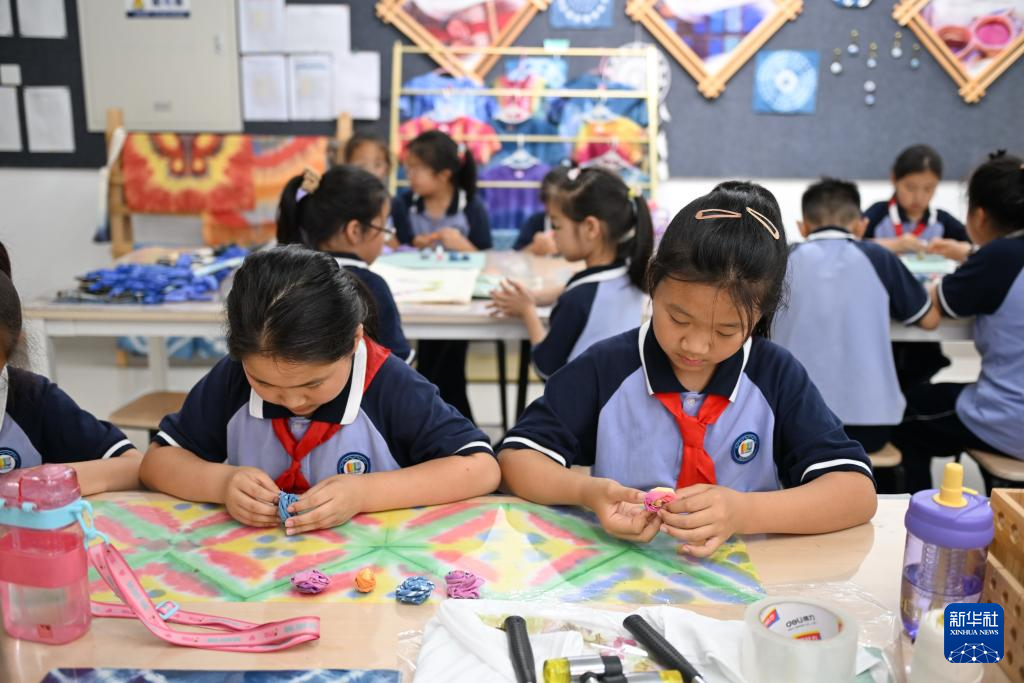 5月23日,雄安容和德辉学校蜡染社团的学生在制作蜡染作品。
