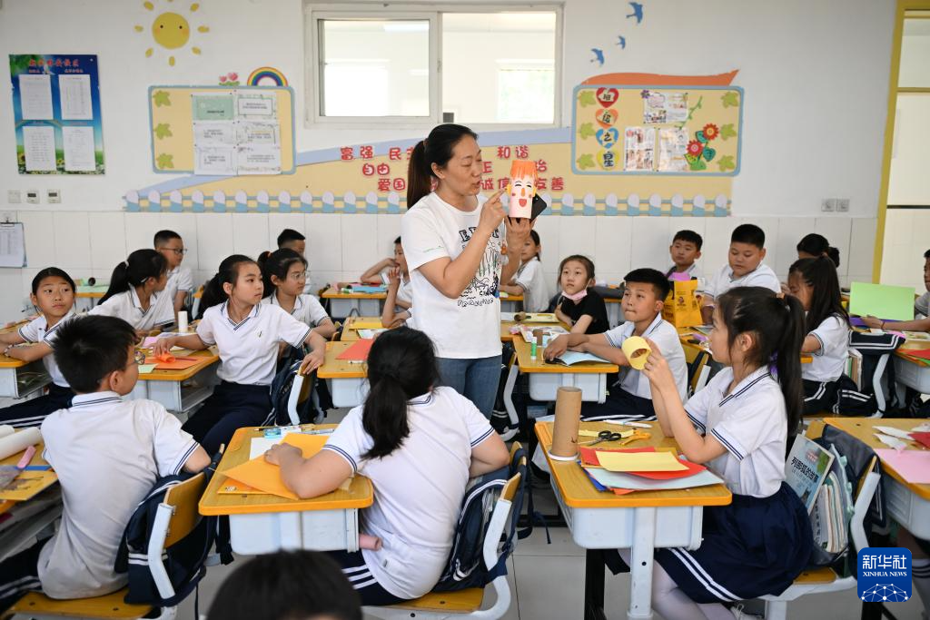5月21日,北京市朝阳区实验小学雄安校区的老师给学生上手工课。