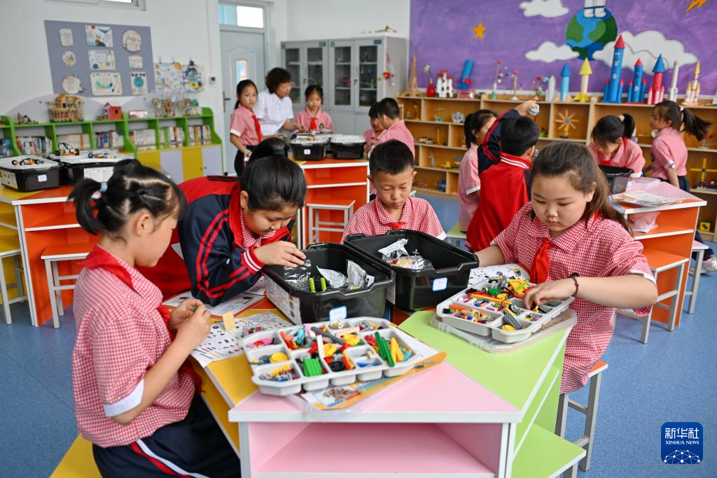 5月24日,雄安新区安新县端村学校学生在科技活动室内组装机器人。