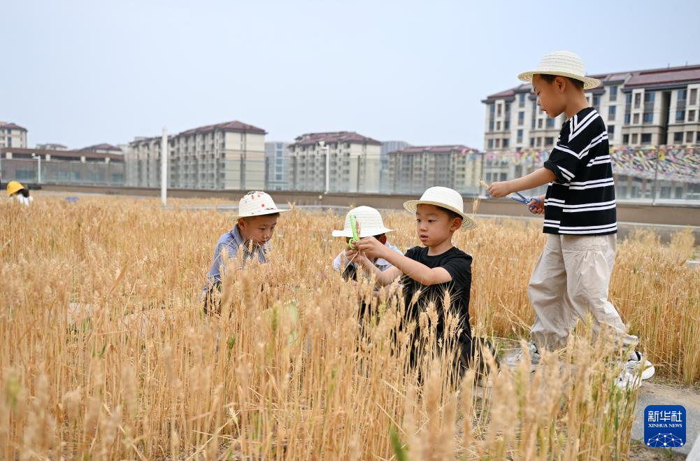 5月23日,雄安容和悦容幼儿园的孩子在“校园农场”里收获小麦。