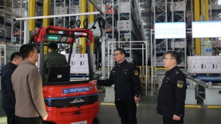 邯郸市生态环境局永年区分局局长王俊杰(右二)在当地一家企业了解新能源非道路移动机械使用情况。邯郸市生态环境局永年区分局供图
