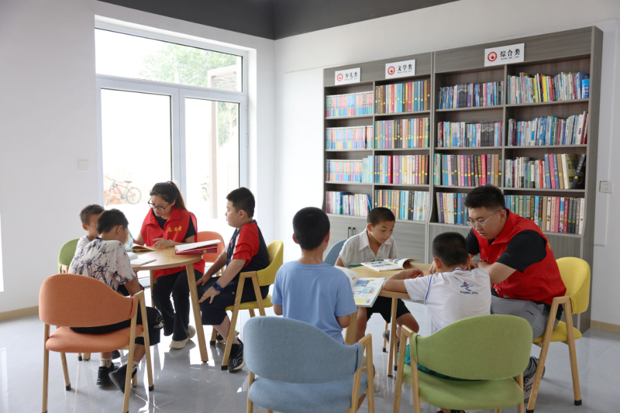 大学生志愿者和孩子们一起阅读。李世强 摄