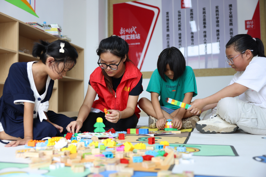 大学生志愿者和孩子们一起搭积木。李世强 摄
