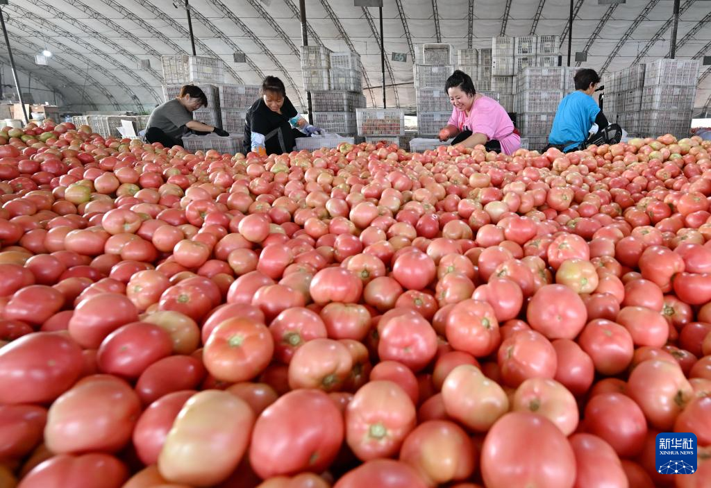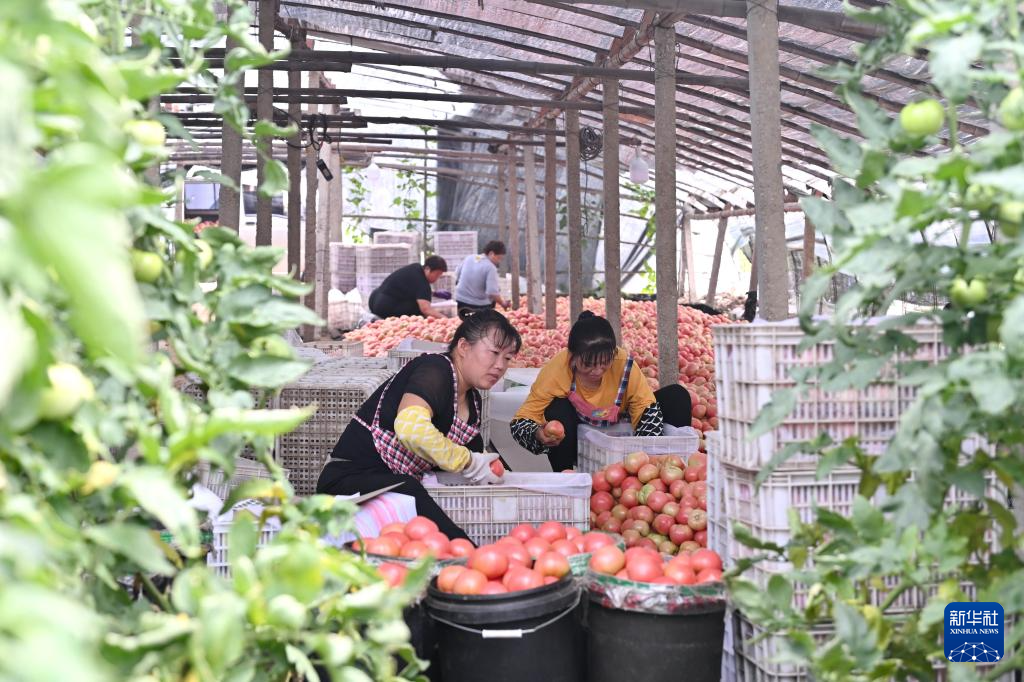 9月8日,河北省滦州市小马庄镇一家蔬菜种植合作社的社员在分拣收获的西红柿。