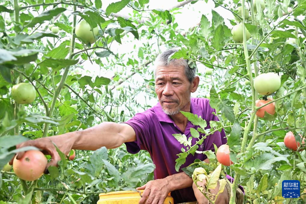 9月8日,河北省滦州市小马庄镇一位农民在大棚内收获西红柿。