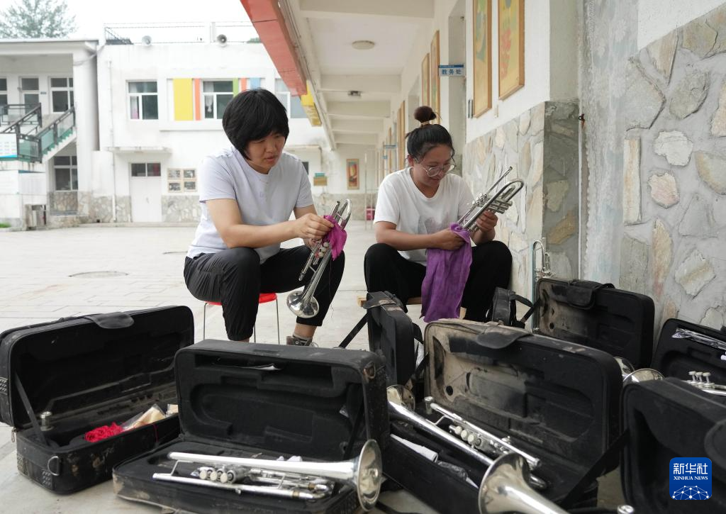 8月11日,在河北省涞水县龙门乡,学校老师在擦拭乐器。