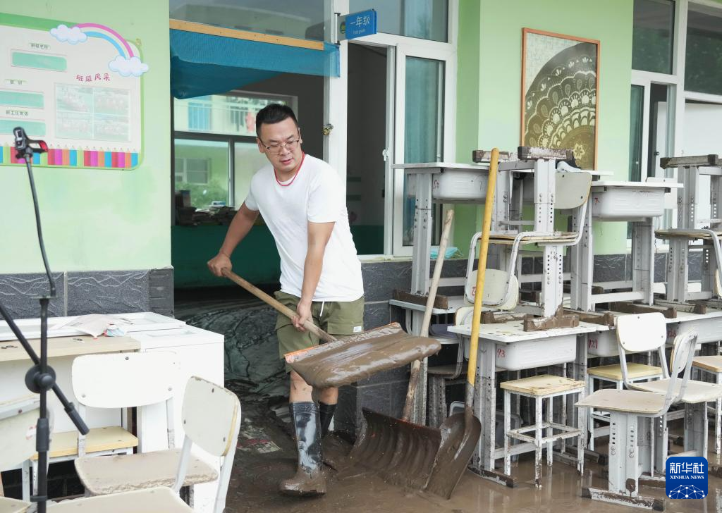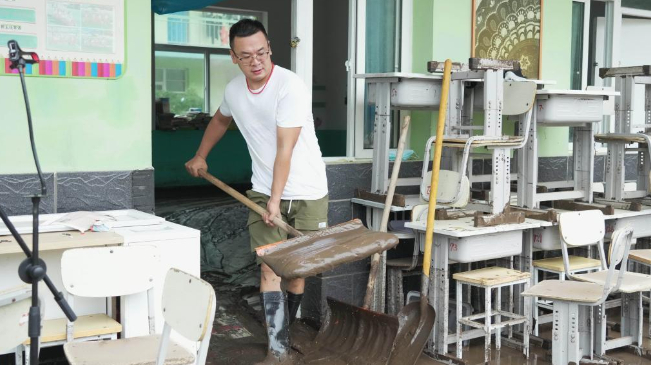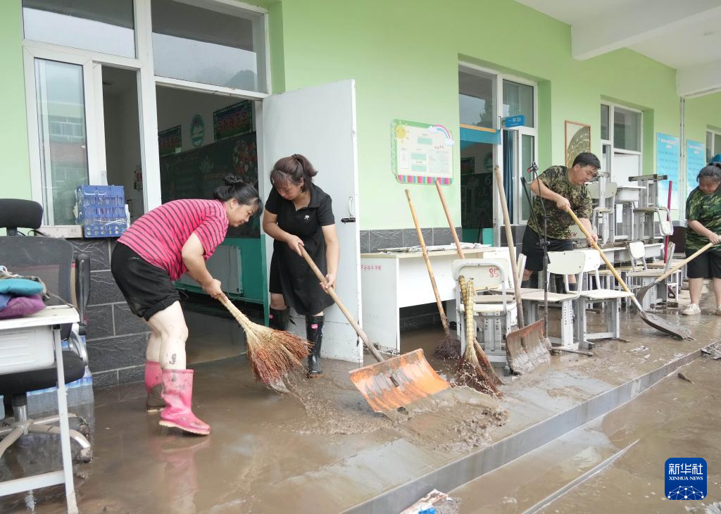 8月11日,在河北省涞水县其中口乡,学校老师在清理教室内的淤泥。