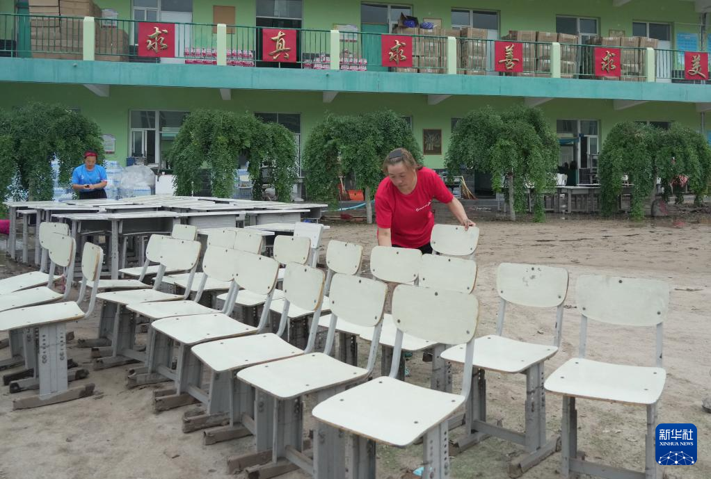 8月11日,在河北省涞水县其中口乡,学校老师在擦洗桌椅。