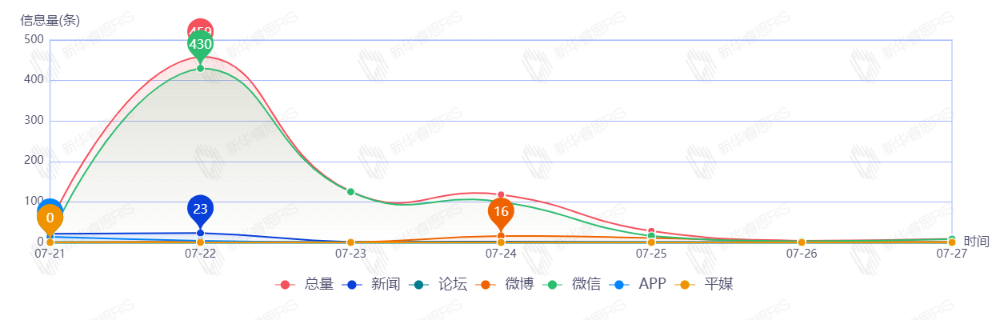 自7月21日首发至7月27日一周内,该文章在互联网上传播总量为792篇。其中7月22日是信息发布的高峰期,发布信息量为459篇文章。各信源的信息发布情况中,微信信息占比最大,其次是新闻和微博,信息量分别为695、47、31,占比分别为87.75%、5.93%、3.91%。(数据来源:新华睿思数据云图分析平台)