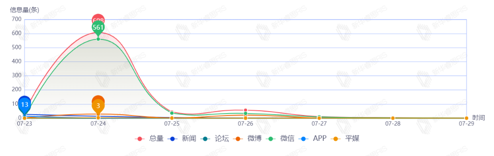 自7月23日首发至7月29日一周内,该文章在互联网上传播总量为768篇。其中7月24日是信息发布的高峰期,发布信息量为608篇文章。各信源的信息发布情况中,微信信息占比最大,其次是微博和新闻,信息量分别为646、57、47,占比分别为84.11%、7.42%、6.12%。(数据来源:新华睿思数据云图分析平台)