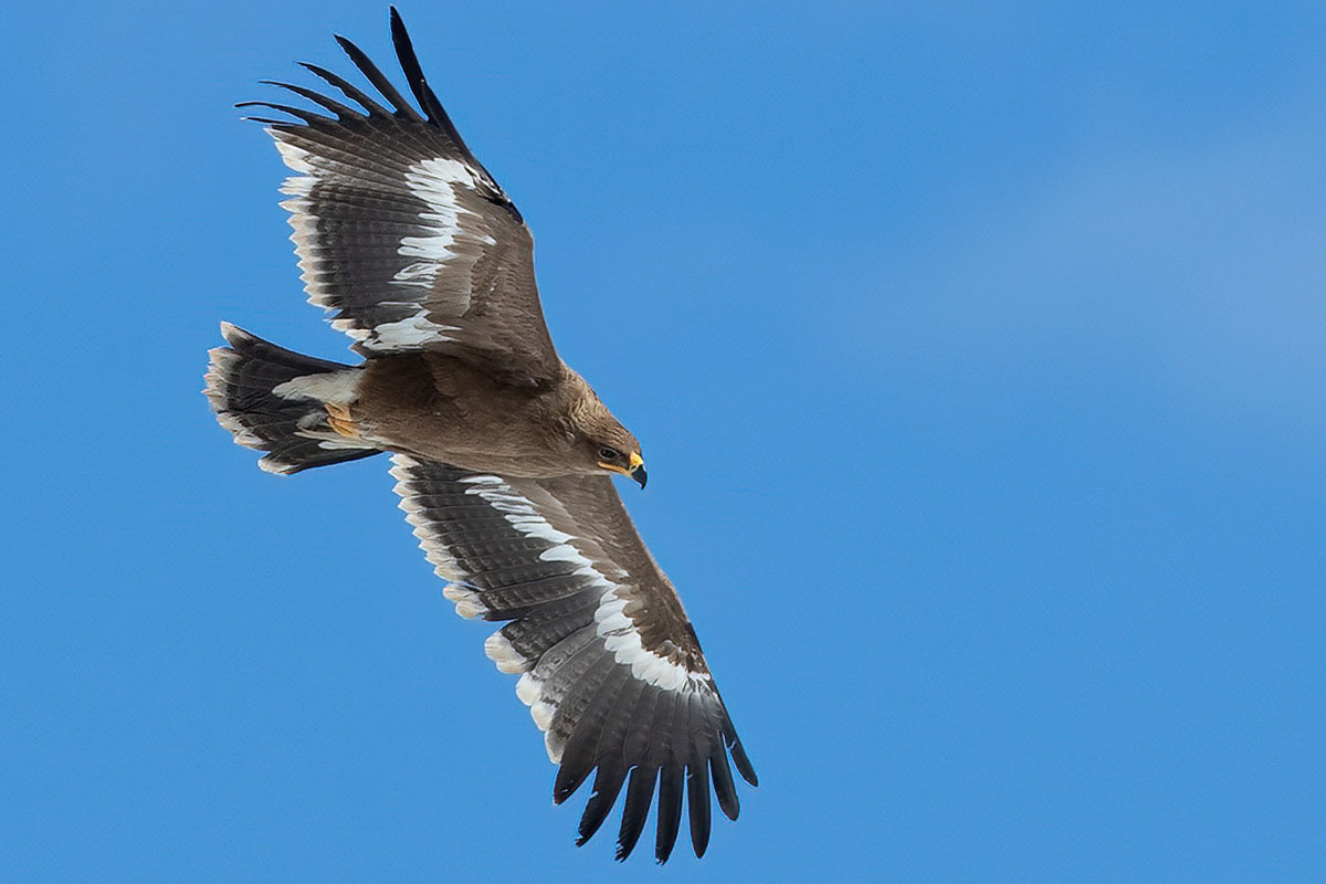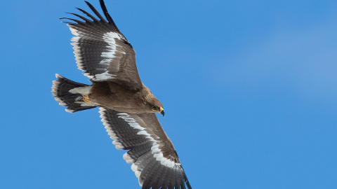 草原雕,别名草原鹰、大花雕,属于大型猛禽,常见于北方干旱的平原。草原雕生性懒散,迁徙时会结群。繁殖期多见于新疆西部、青海、内蒙古及河北。