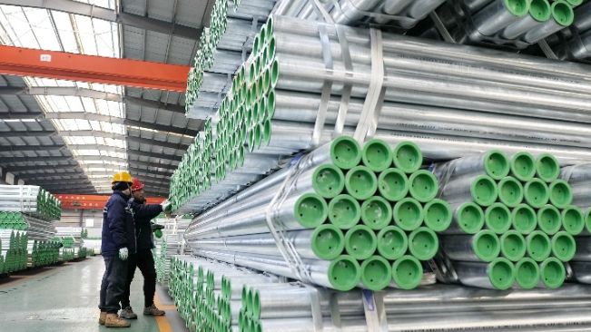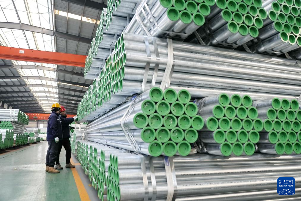 2023年12月28日,河北省迁安市一家钢管出口企业的工人在车间内核对产品信息。新华社记者 牟宇 摄