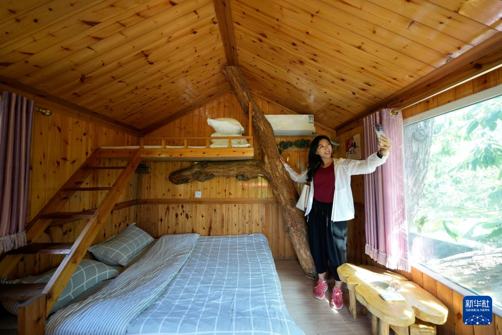 6月29日,游客在河北省迁西县汉儿庄镇一处民宿的房间内自拍。
