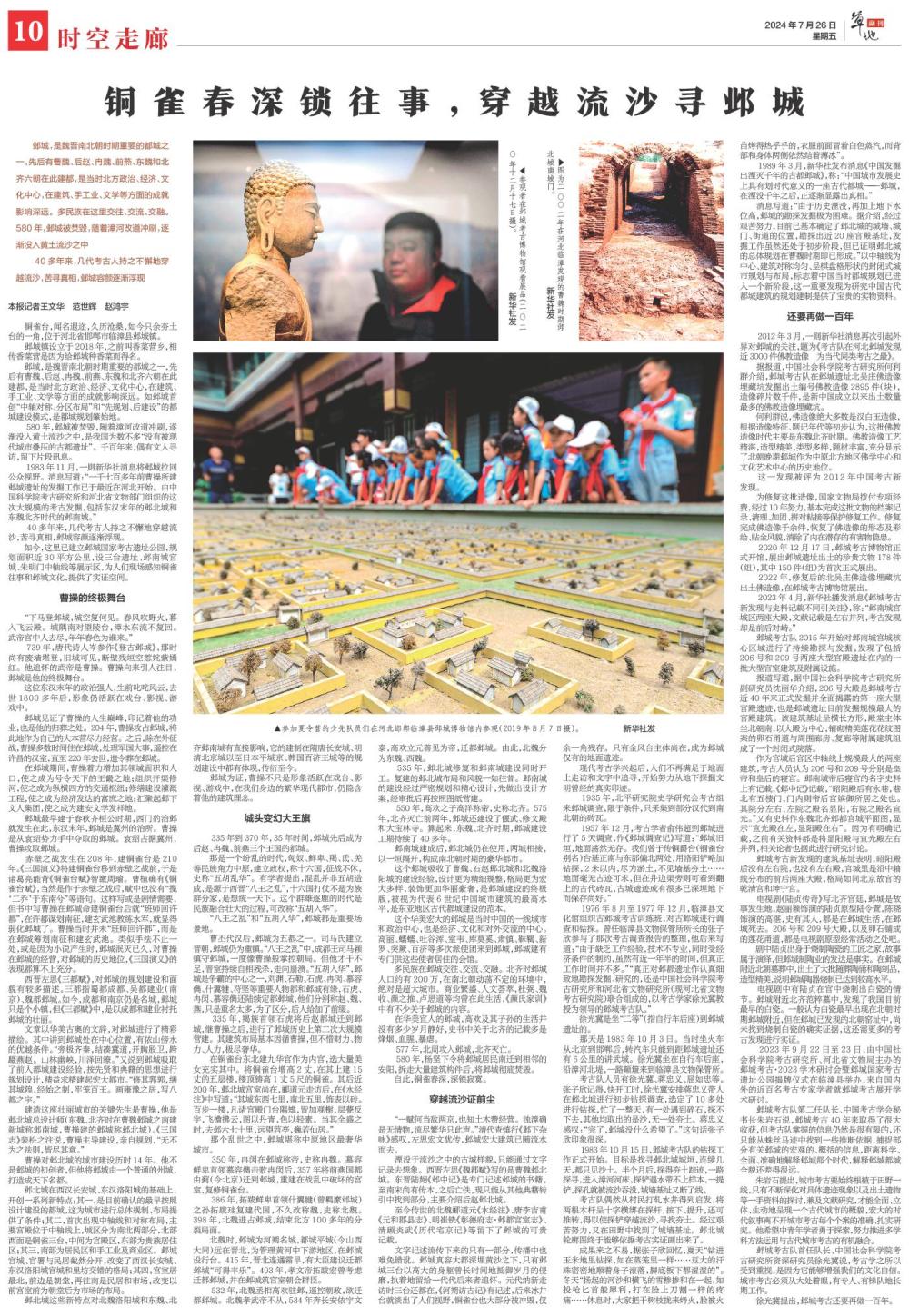 邺城,是魏晋南北朝时期重要的都城之一,先后有曹魏、后赵、冉魏、前燕、东魏和北齐六朝在此建都,是当时北方政治、经济、文化中心,在建筑、手工业、文学等方面的成就影响深远。多民族在这里交往、交流、交融。580年,邺城被焚毁,随着漳河改道冲刷,逐渐没入黄土流沙之中
