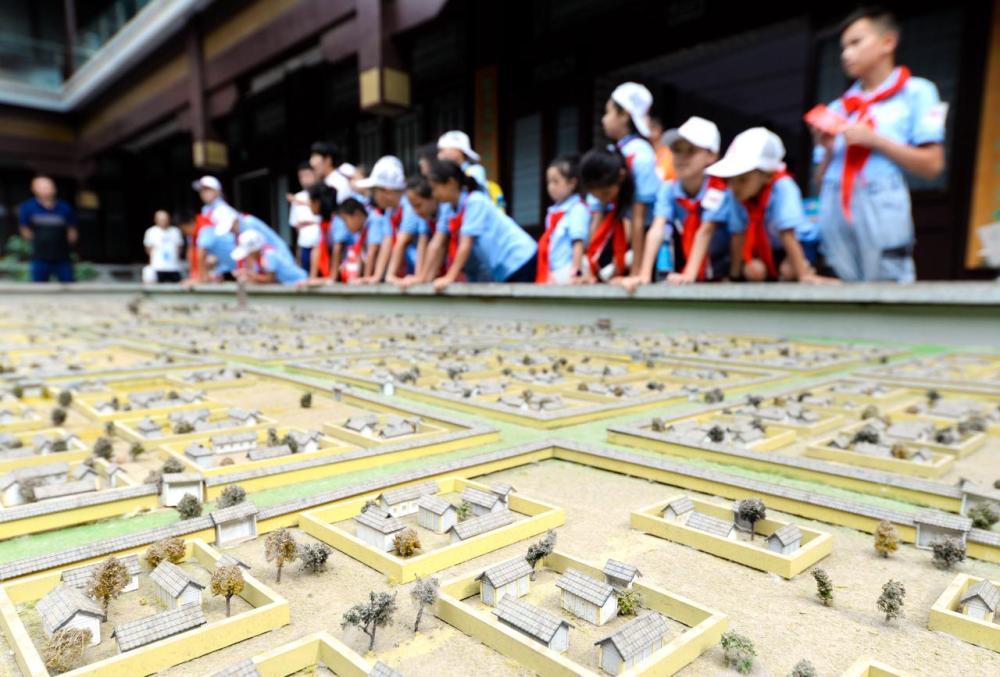 8月7日,参加夏令营的少先队员们在河北邯郸临漳县邺城博物馆内参观。新华社记者 王晓 摄