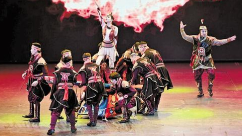 大红背景的舞台上,来自沧州本地的杂技演员们身着古典战袍,将高大的中幡高高抛起,头接、腰接、臂接、肘接,并不时穿插前空翻、侧空翻等各种高难度动作,整个表演精彩不断……