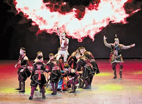 10月28日,第十九届中国吴桥国际杂技艺术节获奖节目故乡行演出在吴桥江湖大剧院拉开帷幕。图为节目《“阿曼拉”——大跳板》演出现场。记者 张昊摄