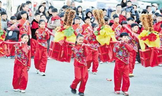 2月15日,邢台市南和区小学生在社区表演省级非遗抬黄杠,欢欢喜喜过大年。河北日报记者 赵永辉摄