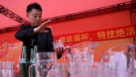 10月30日,参展客商在吴桥杂技魔术装备产业洽谈会上展示杂技魔术装备。