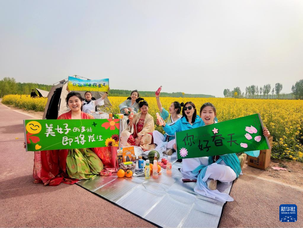 4月15日,游客在南皮县堤顶路沿线的油菜花田打卡拍照。(受访单位供图)