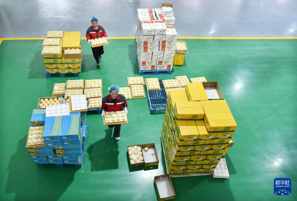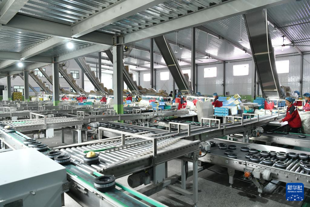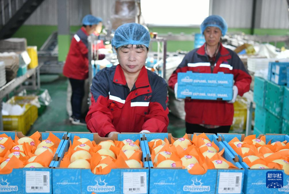 5月7日,河北泊头东方果品有限公司工人在鲜梨分选包装车间工作。