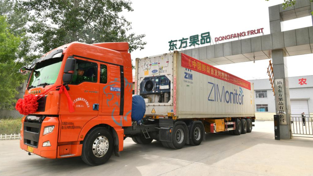 5月7日,在河北泊头东方果品有限公司,载满出口鲜梨的货车驶出厂区。