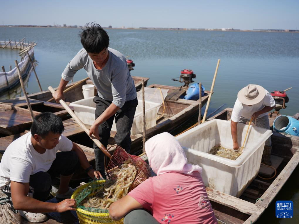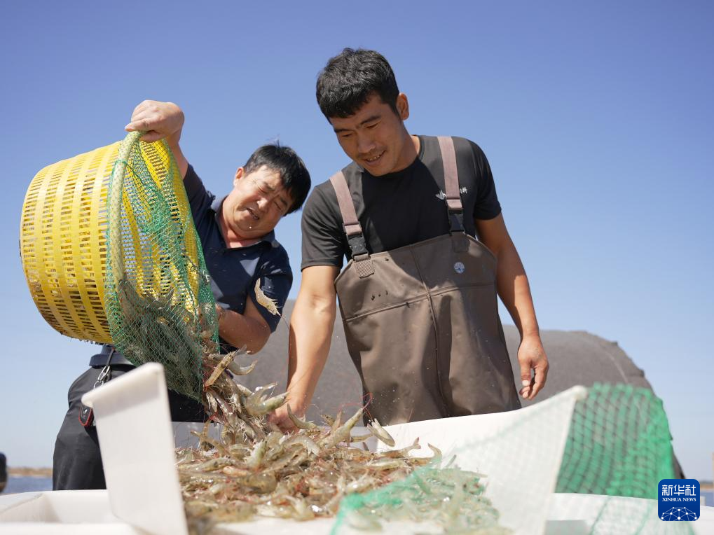 9月13日,养殖户在河北省沧州市海兴县小山乡蔡家庄村养殖虾池收获对虾。