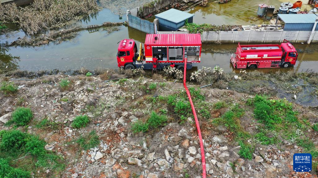 8月7日,唐山市消防救援支队队员在河北省涿州市市区内进行排涝作业时清理水泵附近的杂物。