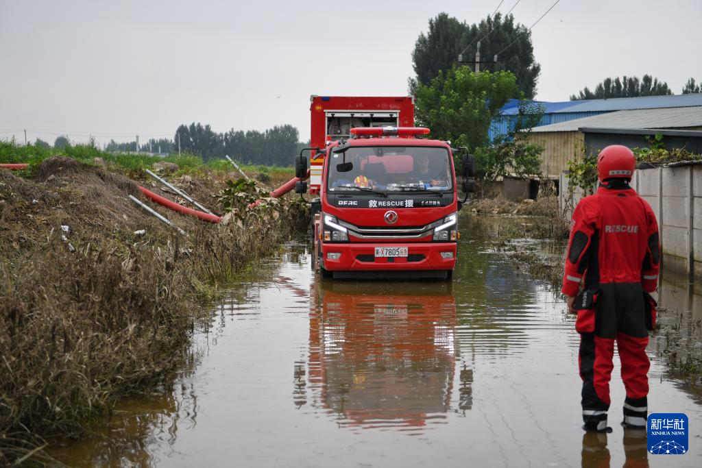 8月7日,保定市消防救援支队队员在河北省涿州市林家屯镇梁家坟村进行排涝作业。