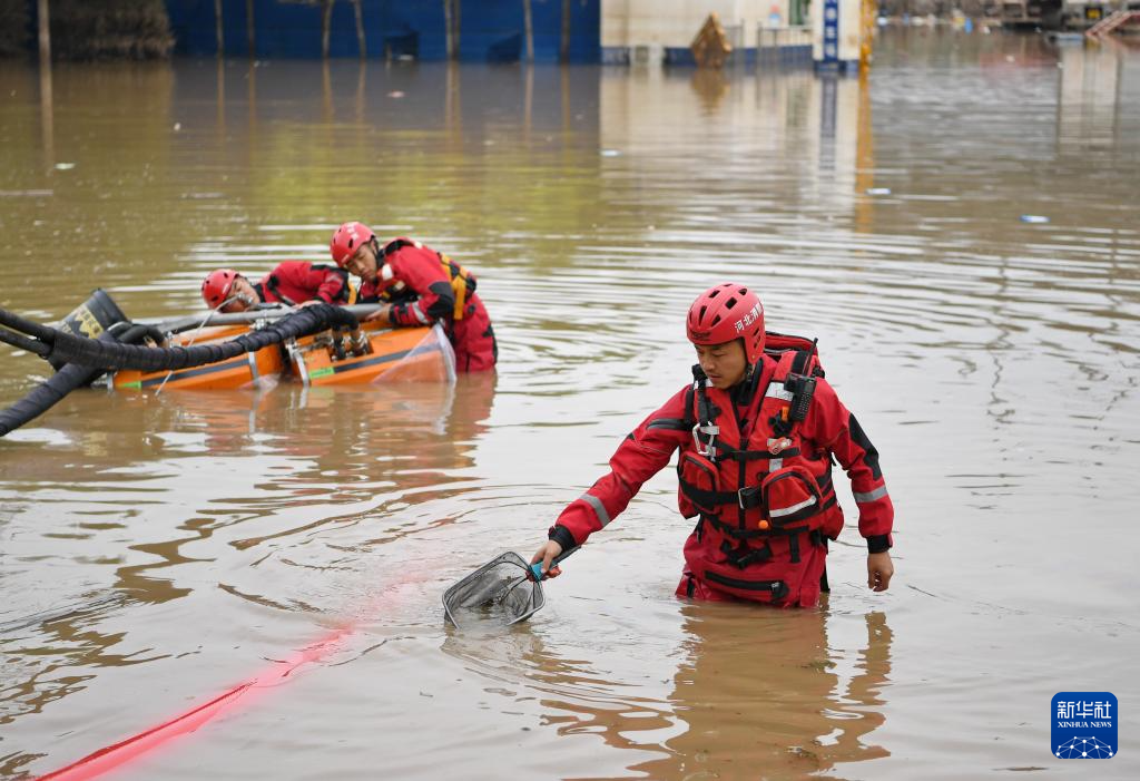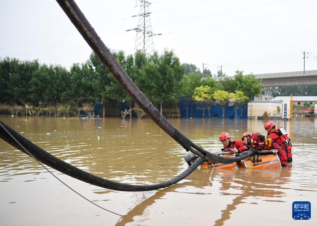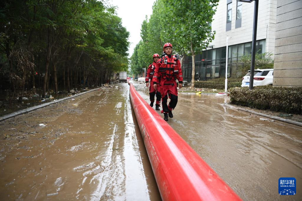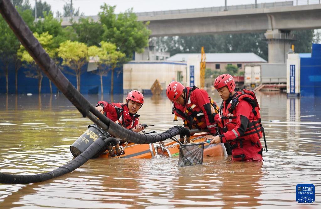 8月7日,唐山市消防救援支队队员在河北省涿州市市区内进行排涝作业。