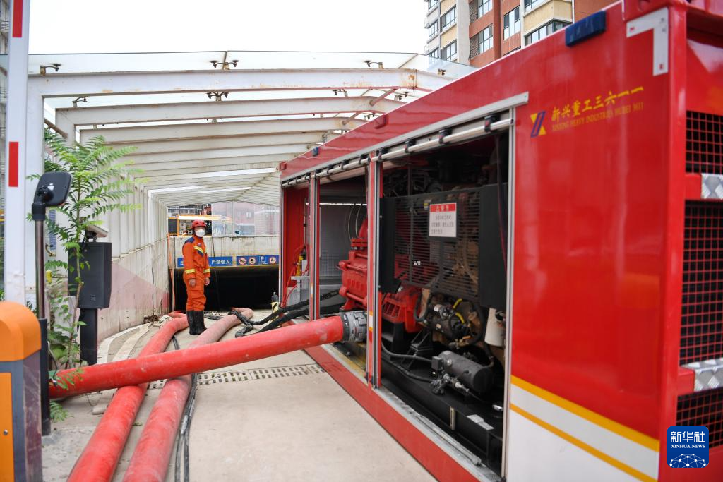 8月7日,邯郸市消防救援支队排水设备在河北省涿州市一小区地下车库排涝现场作业。