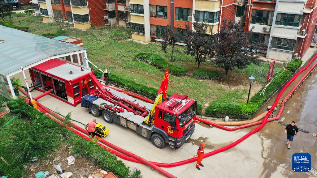 8月7日,邯郸市消防救援支队排水设备在河北省涿州市一小区地下车库排涝现场作业(无人机照片)。