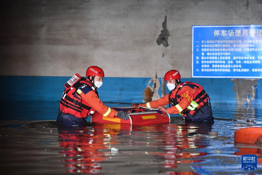 8月7日,邯郸市消防救援支队队员在河北省涿州市一小区地下车库排涝现场清理杂物。