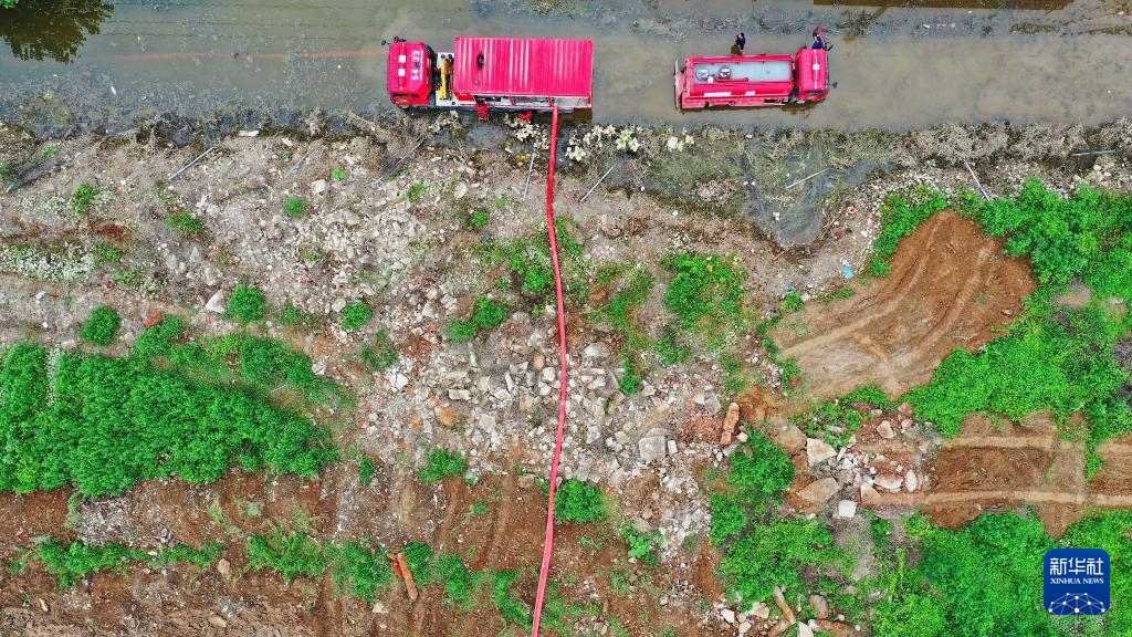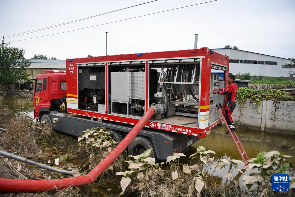 8月7日,保定市消防救援支队排水设备在河北省涿州市林家屯镇梁家坟村进行排涝作业(无人机照片)。
