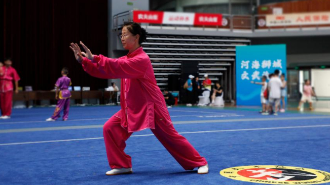 在沧州体育馆一楼大厅,不少参赛选手正在进行赛前适应性训练。选手们拳法凌厉、腿法刚劲,集协调性、灵活性于一身,不时在场地上翻转、跳跃、短跑等。正在进行太极拳训练的郭希茹表示,这是一次相互学习、交流技艺的重要机会,与各地的武术名家切磋,对提升技术水平极为重要。