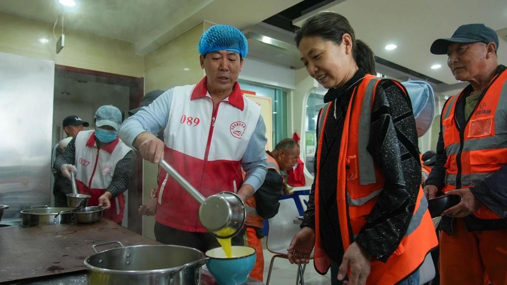 志愿者为前来用餐的环卫工人打饭 刘星辰 摄
