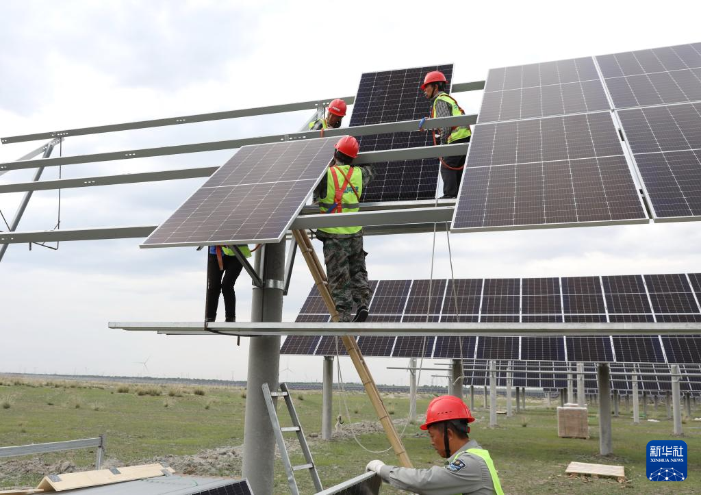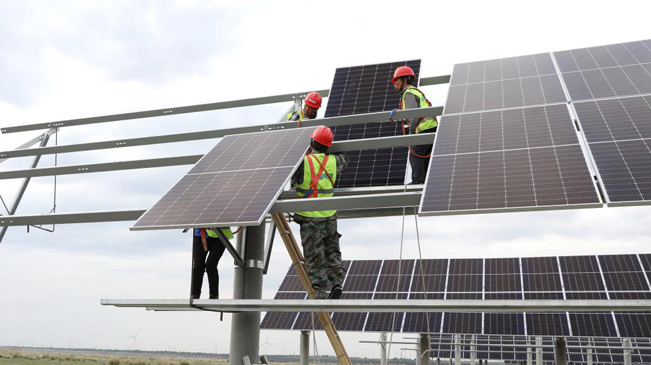 7月11日,在张家口市康保县张纪镇,工人在一处光伏发电场建设工地施工。