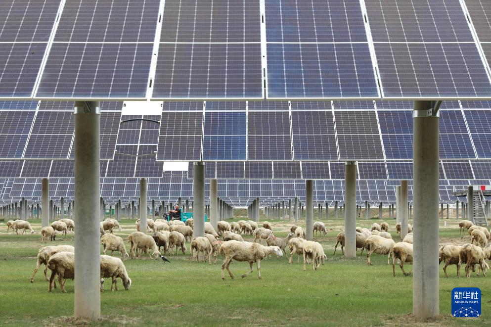 7月11日,在张家口市康保县张纪镇,羊群在光伏板下觅食。