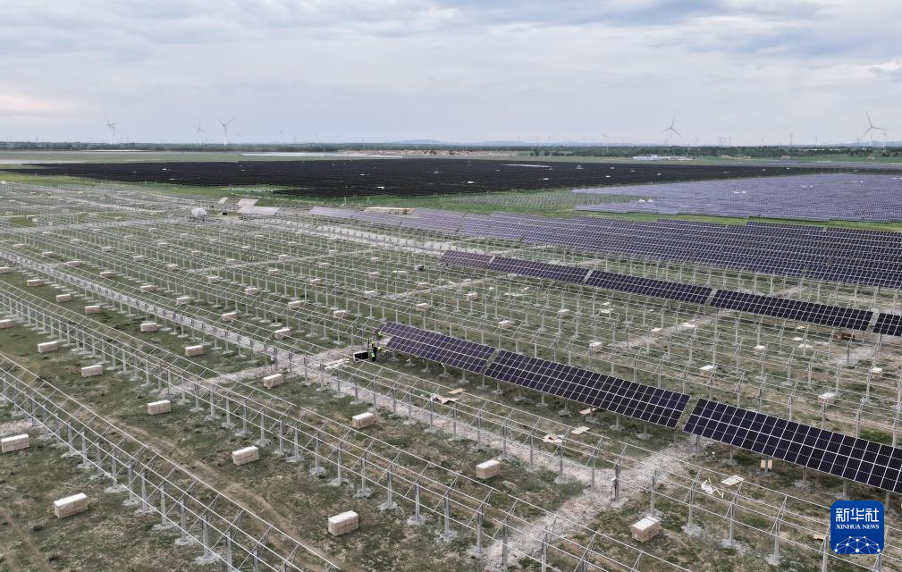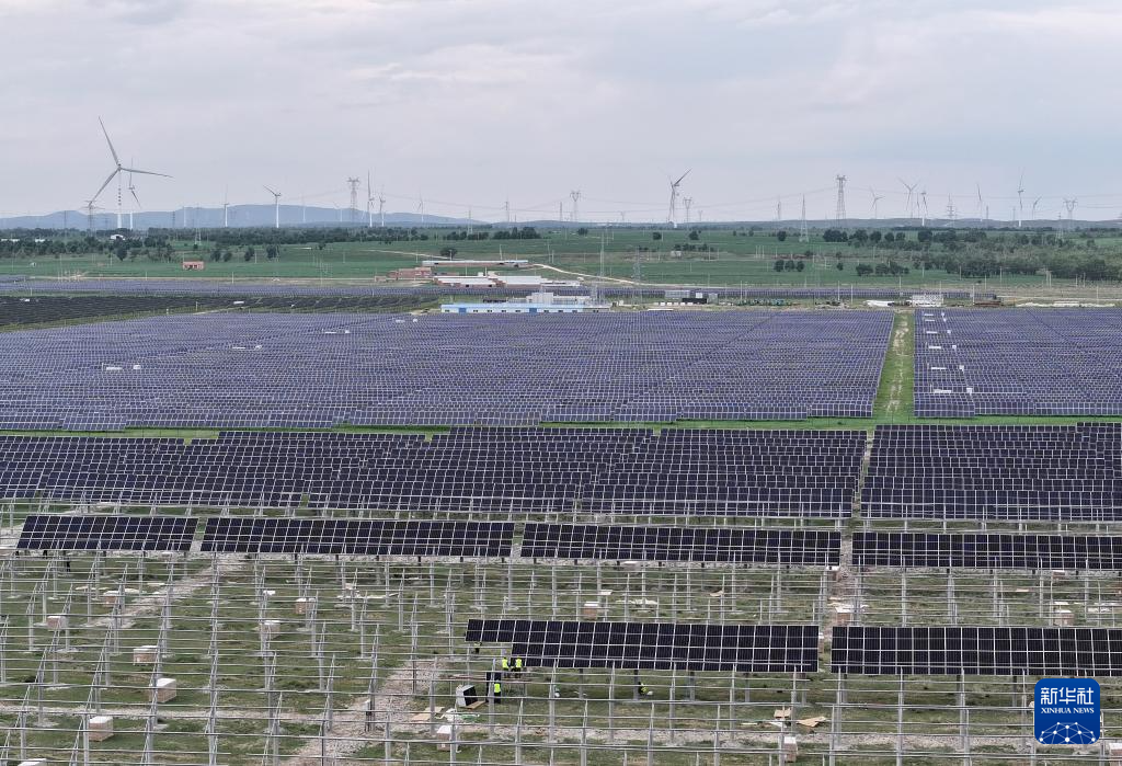 这是张家口市康保县张纪镇一处施工中的光伏发电场(7月11日摄,无人机照片)。